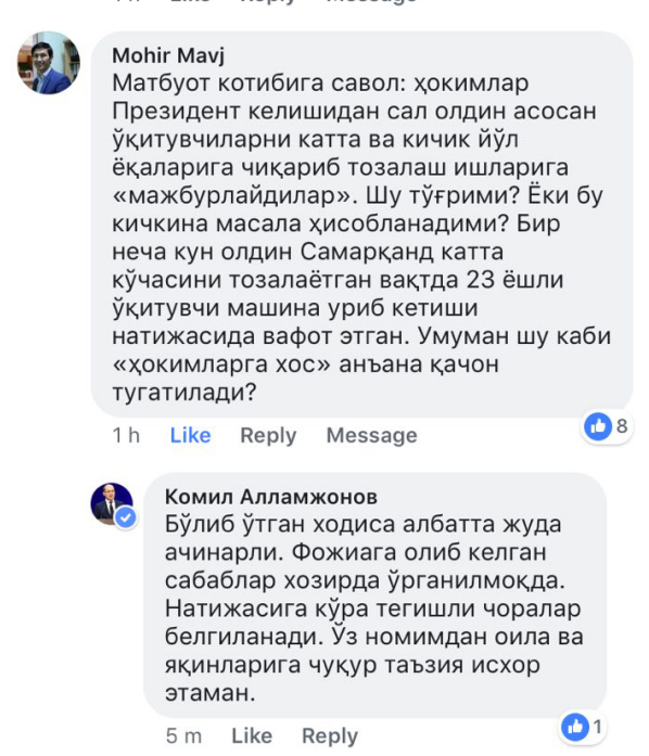 Отвечая на вопрос одного из пользователей Facebook на своей странице, Алламжонов выразил соболезнования родным и близким погибшей, а также заявил, что в курсе случившегося.