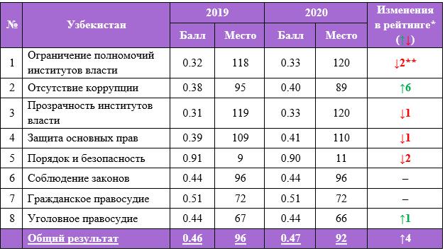 Результаты республики по составным индикаторам индекса “Верховенства закона” приведены в таблице ниже: