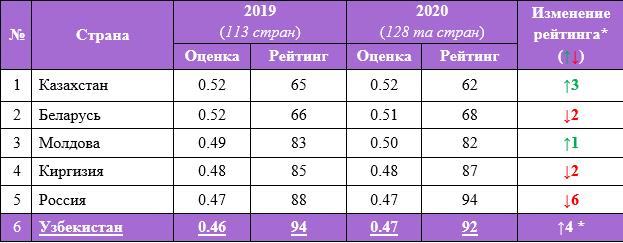 Согласно отчету, Республика Узбекистан в общем рейтинге с 0.47 баллами поднялся до 92 позиции.