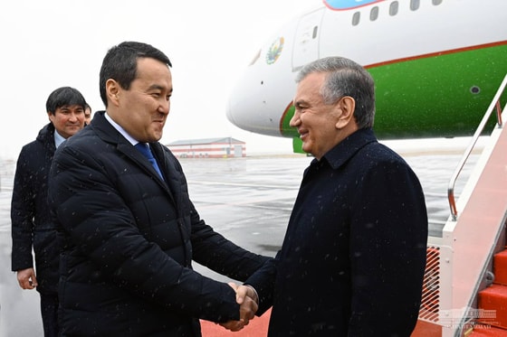 В аэропорту Шавката Мирзиёева встретили премьер-министр Казахстана Алихан Смаилов и другие официальные лица.