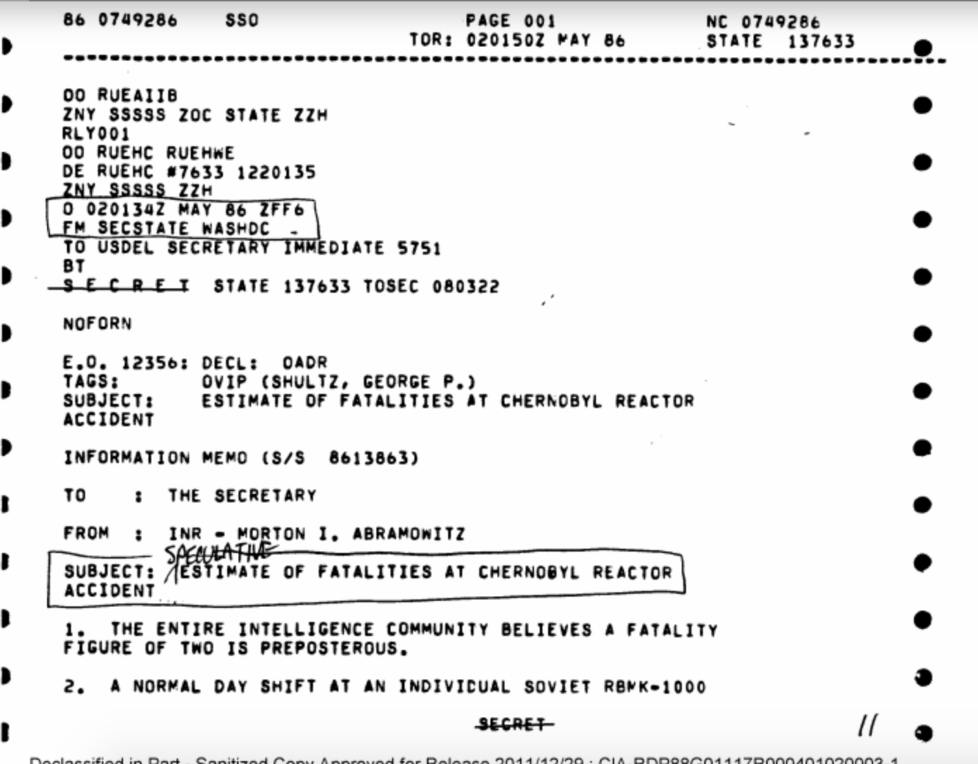 Отчет был направлен 2 мая 1986 года на имя государственного секретаря США (эту должность тогда занимал Джордж Шульц) Мортоном Абрамовицем. Он отмечает, что все научное сообщество считает «ерундой» гибель лишь двух человек в результате катастрофы, как утверждается в официальных данных.