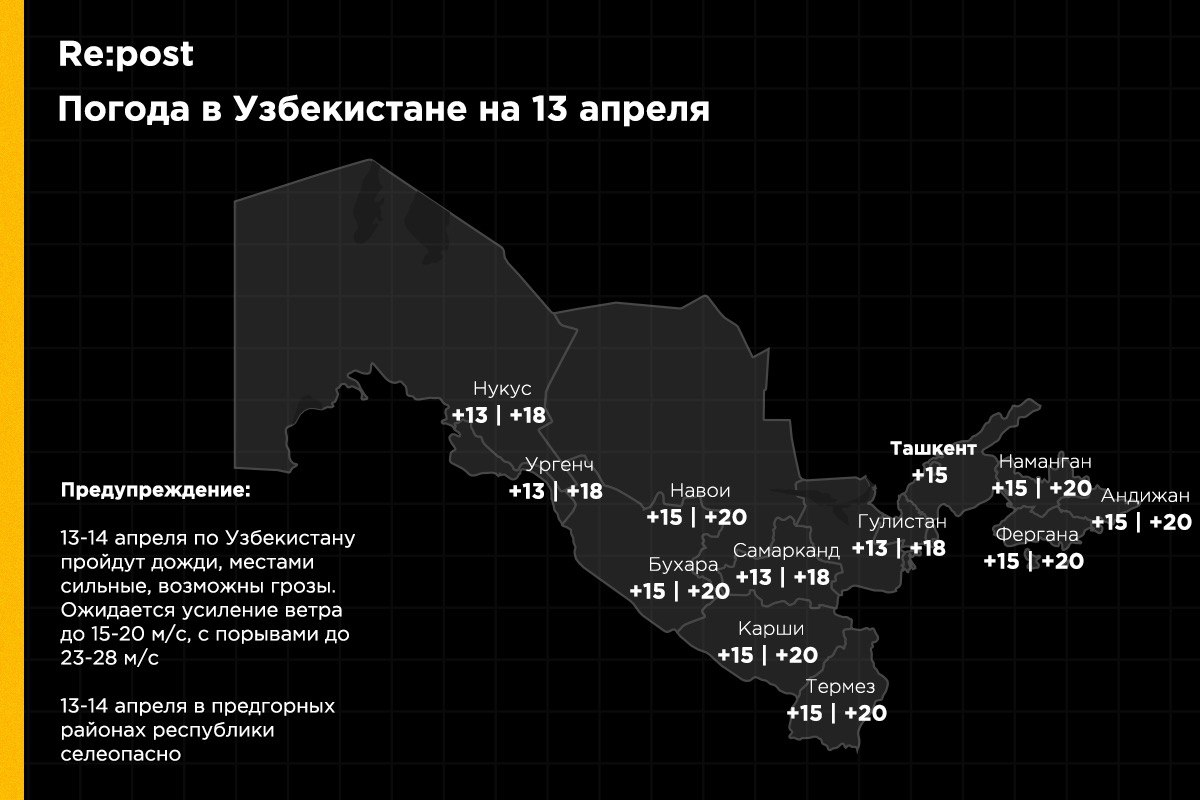 13 апреля по данным Узгидромета практически вся территория Узбекистана будет находиться под влиянием относительно теплой, но очень влажной воздушной массы. По большей части территории республики пройдут дожди, местами сильные. По Бухарской и Навоийской областям небольшой дождь пройдет лишь в утренние часы, а по Каракалпакстану и в Хорезмской области ожидается погода без осадков.