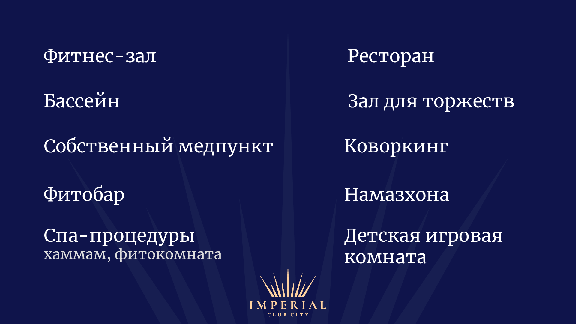 В современном мире люди тратят много времени на дорогу, чтобы получить привычные им услуги. В клубном городе эта проблема решена: Imperial Club City предусматривает все необходимые удобства на территории комплекса. Более 2000 м² полезной площади для каждого резидента ЖК.
