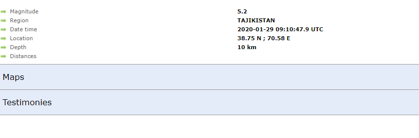 По данным Республиканского Центра Сейсмопрогностического Мониторинга МЧС 29 января в 14:10 по Ташкентскому времени (29.01.2020 в 09:10 по Гринвичу) произошло землетрясение в Таджикистан-Афганистан погран.обл. Координаты: 38,40 градуса северной широты, 70,75 градуса восточной долготы. Магнитуда М=5,3. Глубина h=60 км. Расстояние от Ташкента 344 км в южном направлении.