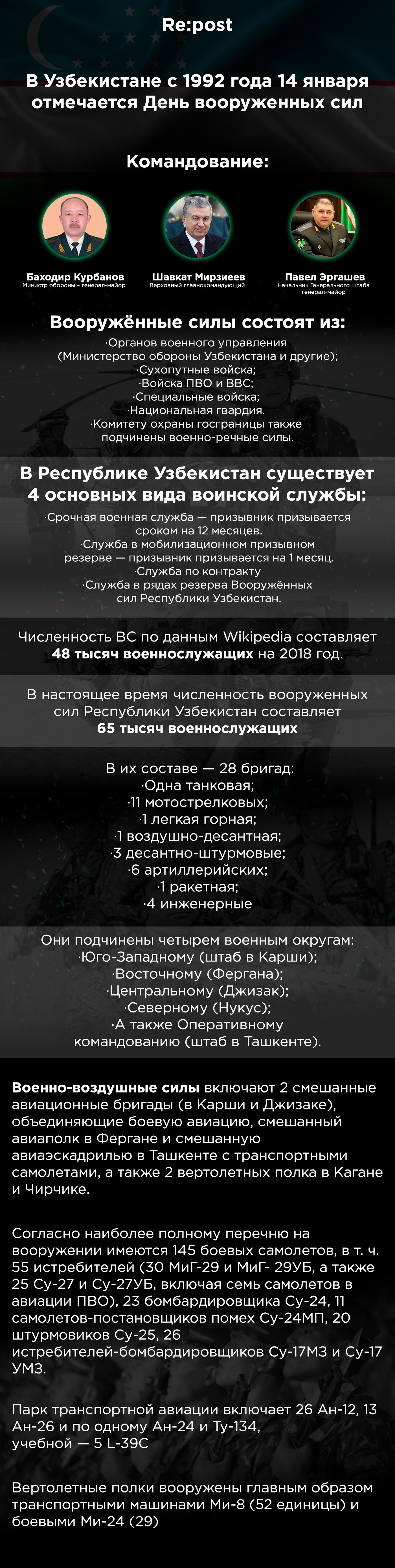 Узбекистан 14.01.2020 | 11:27 Армия Узбекистана в цифрах и фактах 14 января в Узбекистане – День защитников Родины. Этот праздник отмечается ежегодно с января 1992 года. Собрали для вас главные факты о государственной армии. Больше важных новостей в Телеграм-канале @RepostUZ. Последние новости Жителей одного из районов Ташкента временно оставят без газа 15.04.2026 | 12:37 Трамп заявил, что НАТО не помогла США 15.04.2026 | 12:27 Музей военной техники в Германии запретил вход гражданам 26 стран, включая Узбекистан 15.04.2026 | 12:11 Узбекистан и Афганистан подписали торговые соглашения более чем на $500 млн 15.04.2026 | 11:41 «Эту проблему за одну ночь не решить». Вэнс заявил, что США настроены на переговоры с Ираном 15.04.2026 | 11:25 У Дворца дружбы народов в Ташкенте демонтировали рекламные баннеры 15.04.2026 | 11:11 Трамп считает, что операция против Ирана близка к завершению 15.04.2026 | 10:32 С мигалкой и без номеров: в Ташкенте наказали парней, грубо нарушивших ПДД 15.04.2026 | 10:11 Шавкат Мирзиёев поздравил работников культуры и искусства Узбекистана 15.04.2026 | 09:55 Шавкат Мирзиёев обозначил приоритетные задачи в сфере жилищного строительства и урбанизации 14.04.2026 | 22:09