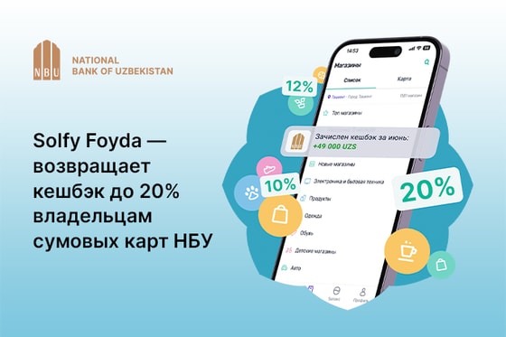 Программа кешбэка Solfy Foyda доступна бесплатно для всех клиентов «Узнацбанк», которые совершают покупки в магазинах-партнерах и оплачивают их дебетовыми картами в сумах. Накапливайте кешбэк в течение месяца и получайте его автоматически на свою карту до конца следующего месяца. Полученные деньги можно свободно использовать по своему усмотрению, без ограничений. Solfy Foyda уже работает с вашей дебетовой картой Банка в сумах и не требует дополнительного подключения.