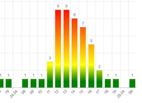 Девятибалльный показатель будет наблюдаться в 12:00-13:00. Низкие значения ожидаются ближе к 17:00.