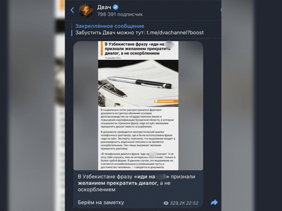 В свою очередь, Telegram-канал «Игорь, начинайте работу» (более 140 тысяч подписчиков) поблагодарил лингвистов из Узбекистана за обновление правил деловой коммуникации. Похожий пост появился и в канале «Лидер мнений среди удобрений» (141 тысяча подписчиков).
