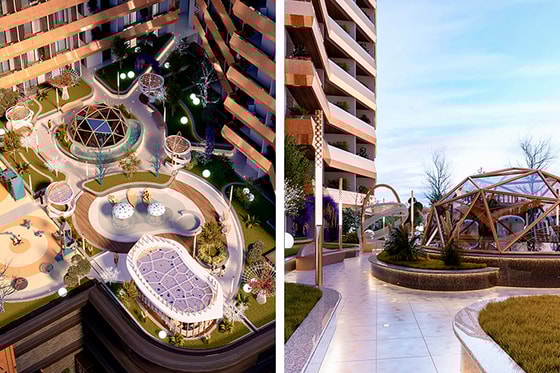 Одно из уникальных решений комплекса — футуристичный двор на уровне 4-го этажа с видом на парк. Здесь предусмотрены лаунж-зоны с фонтанами, воркаут, прогулочные дорожки и детские площадки.