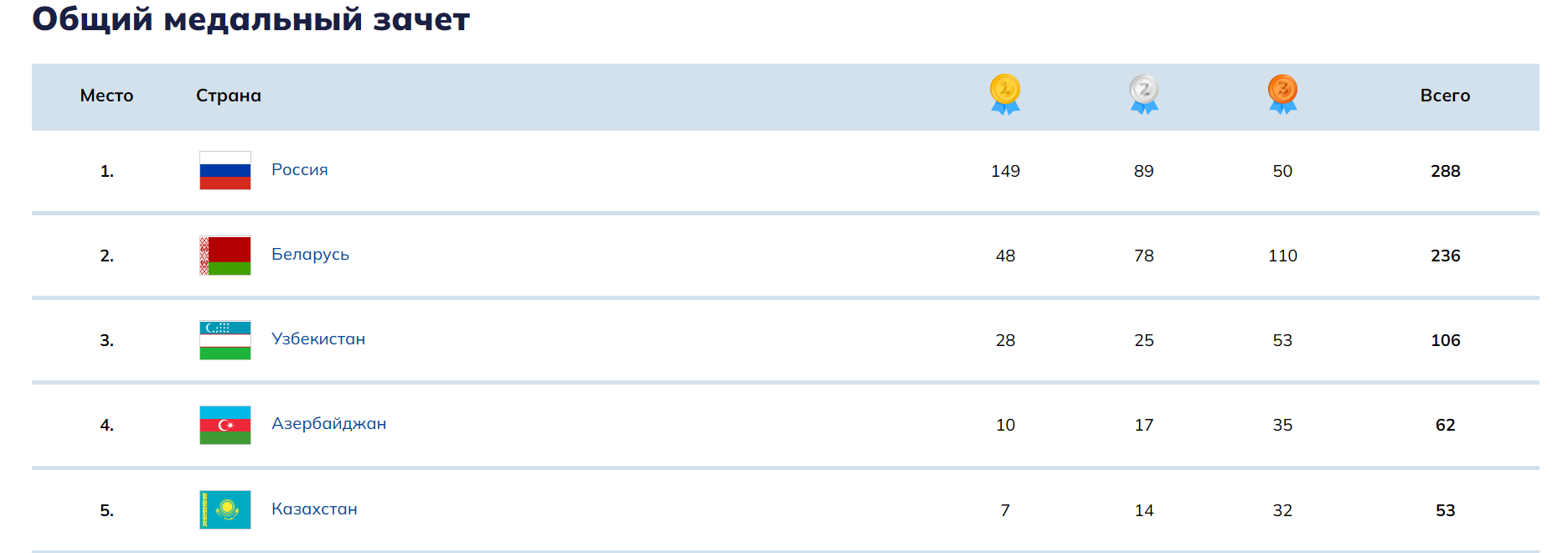 В их числе 28 золотых, 25 серебряных и 53 бронзовых наград. Узбекистан занял третье место в общекомандном зачете, уступив лишь России и Беларуси.