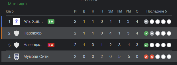 Положение узбекских клубов после сыгранных матчей: