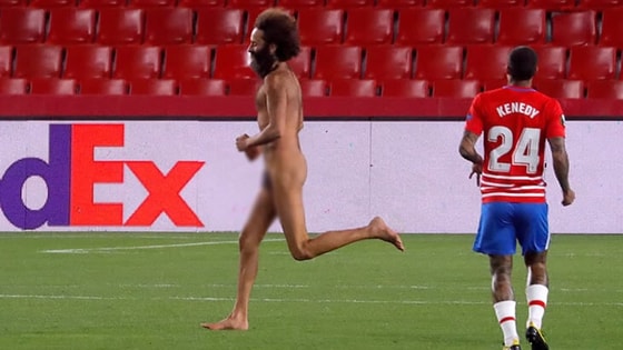 На матче «Гранада» – «МЮ» в рамках 1/4 финала Лиги Европы, который состоялся ночью 8 апреля, голый болельщик выбежал на поле «Нуэво Лос Карменес», после чего упал на траву. Полиция сразу же увела буйного зрителя, сообщает Sports.ru.