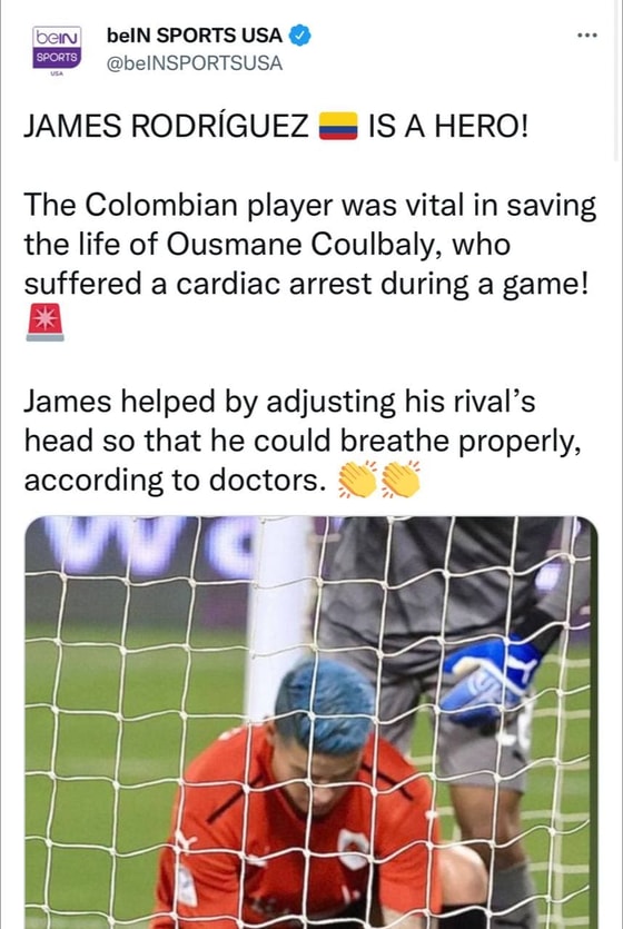 Как сообщает beIN Sports в Twitter, важную роль в спасении жизни Кулибали сыграл хавбек хозяев Хамес Родригес, известный по играм за «Реал» и «Эвертон». Полузащитник правильно расположил голову пострадавшего на газоне, что позволило ему нормально дышать.