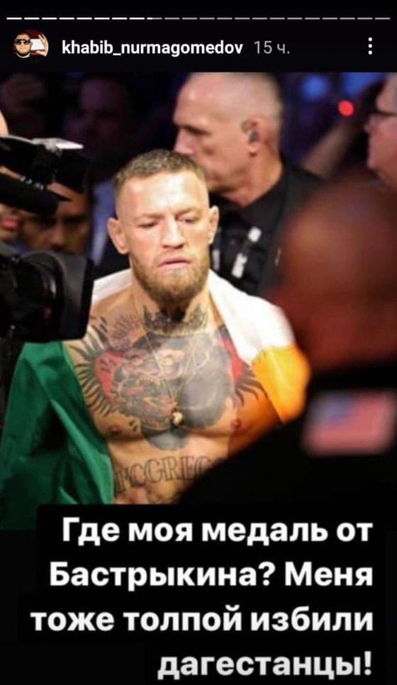 13 октября Нурмагомедов опубликовал фото Макгрегора после их поединка, подписав «А где моя медаль от Бастрыкина? Меня тоже толпой избили дагестанцы».