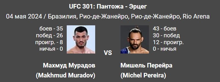 Соперником узбекистанца станет бразилец Мишель Перейра. Бойцы проведут поединок на турнире UFC 301, который пройдет в Бразилии.