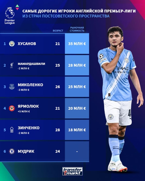 Узбекский защитник «Манчестер Сити» Абдукодир Хусанов возглавил список самых дорогих игроков Английской Премьер-лиги из постсоветских стран, следует из данных Transfermarkt.