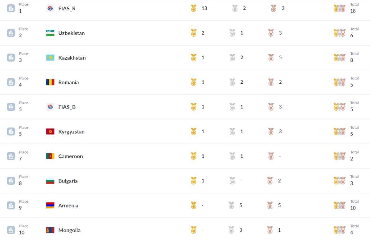 Россия расположилась на первом месте (13 золотых, две серебряные и три бронзовые награды), а Казахстан на третьем (одна золотая, две серебряные и пять бронзовых медалей).