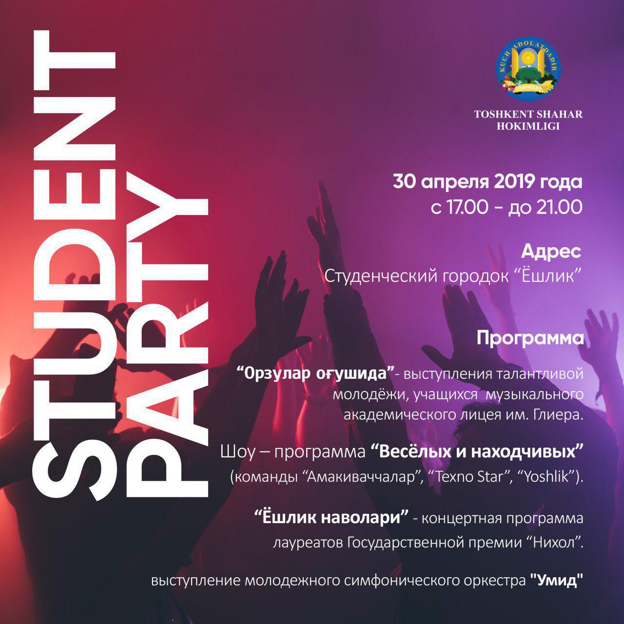 30 апреля хокимият города Ташкента организует традиционный студенческий фестиваль Student Party, который пройдет в студенческом городке «Ёшлик».