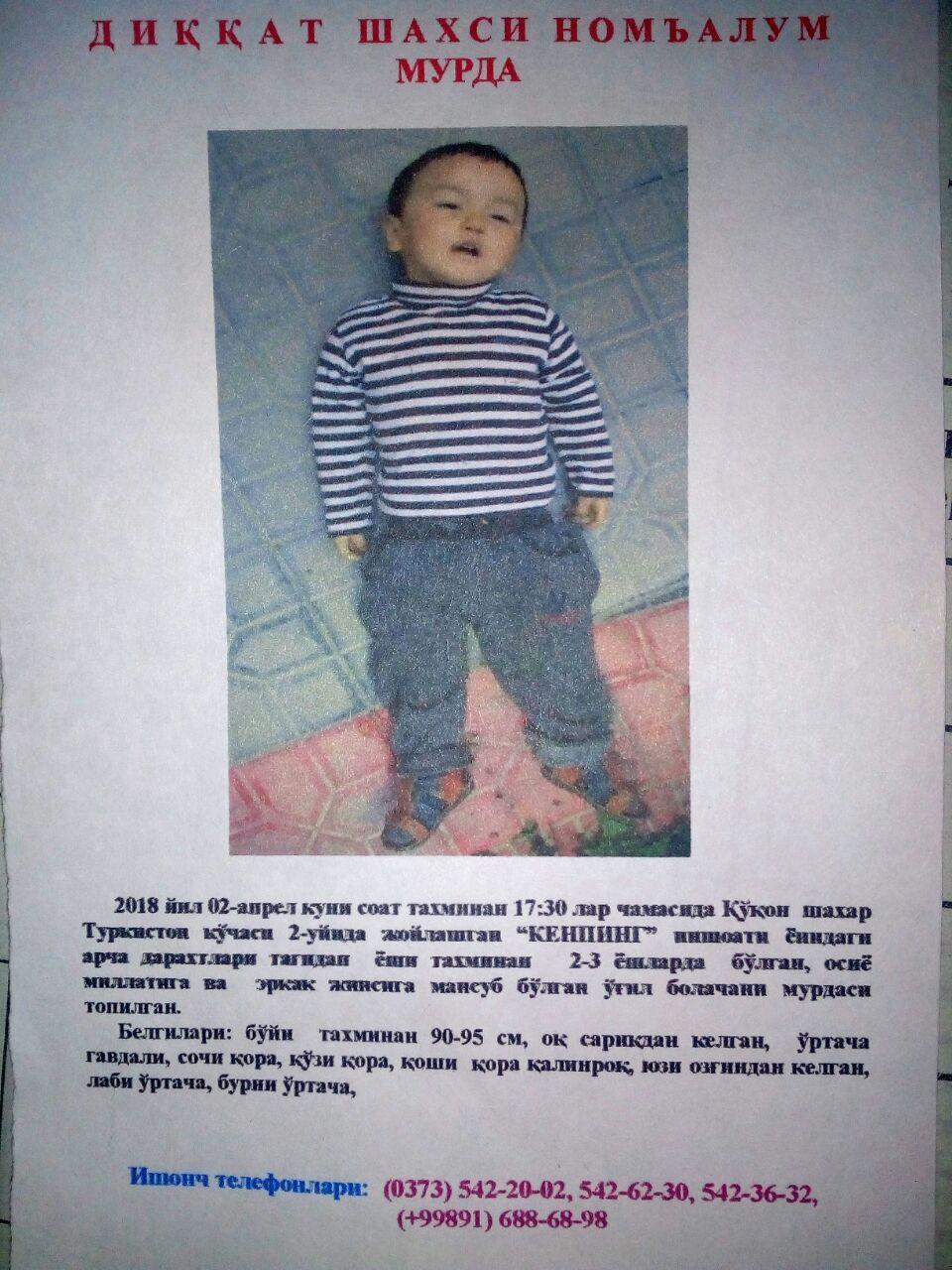 2 апреля текущего года в 17:30 в Коканде недалеко от станции Коканд-Ташкент автовокзала было обнаружено тело трехлетнего мальчика – Фирдавсбека Ибрагимжанова.