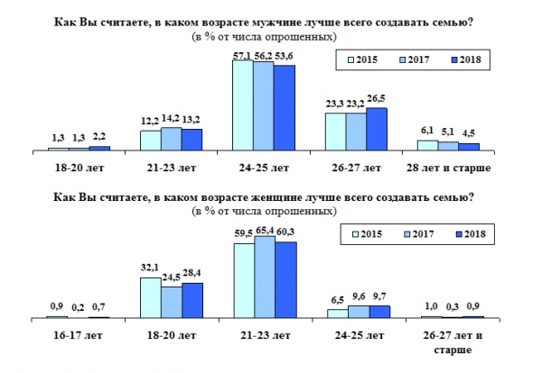 Для женщин оптимальным возрастом 60,4% опрошенных выбрали 21-23 года. Узбекистанцы стали больше одобрять идею раннего брака для женщин (18-20 лет). Этому варианту отдали предпочтение 28,4% опрошенных против 24,5% за прошлый год. За возраст 18-20 лет для мужчин проголосовали всего 2,2% опрошенных. Ещё 0,7% опрошенных отдали свои голоса за 16-17 лет для вступления в брак представительницами прекрасного пола.