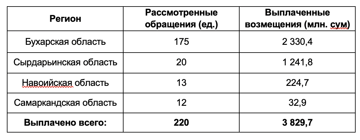 В ускоренном режиме были рассмотрены заявления клиентов и в кратчайшие сроки обеспечена выплата страховых возмещений, объём которых по состоянию на 12 июня т.г. составил более 3,8 миллиардов сумов.