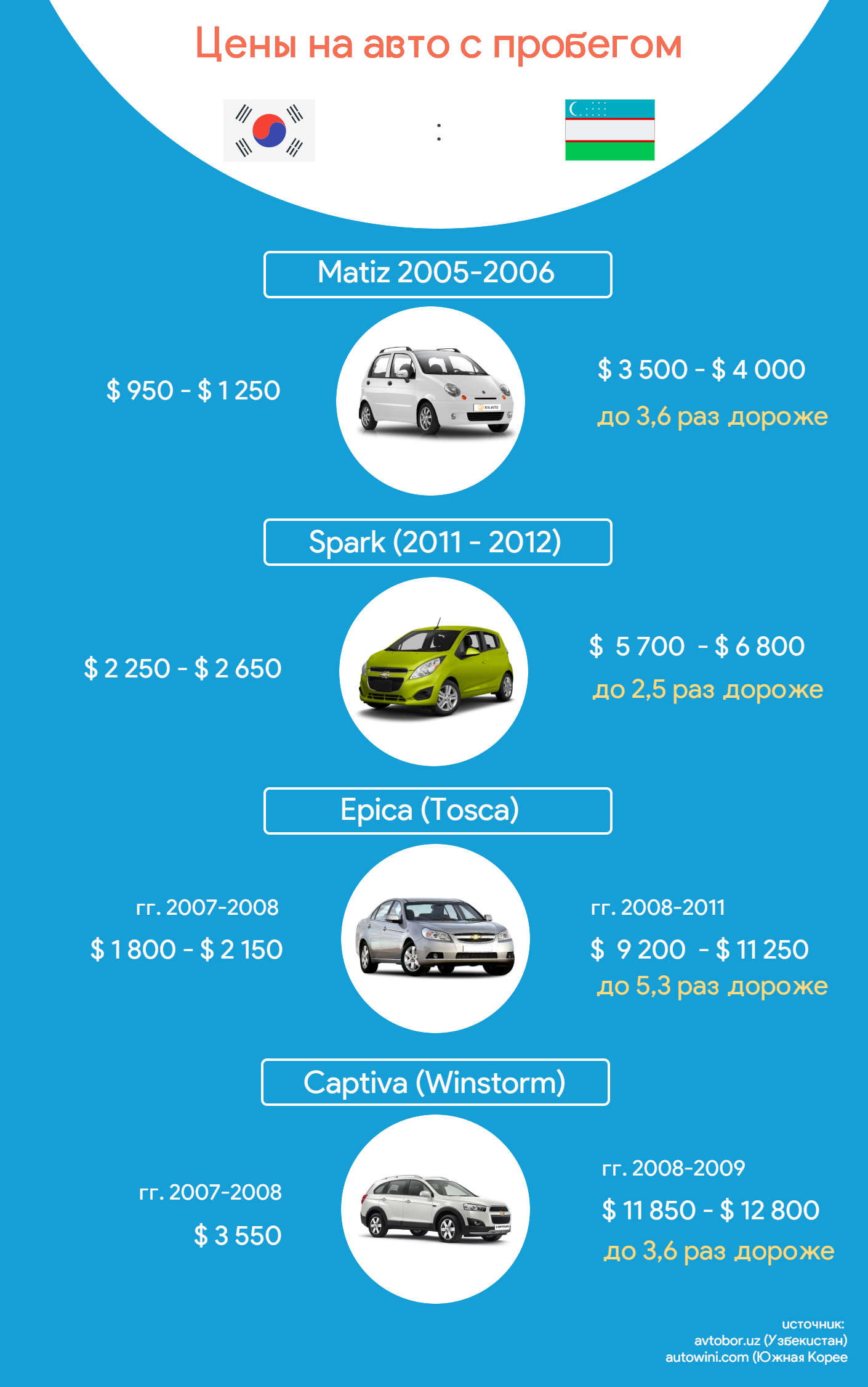 Многие в курсе, что часто цены на новые авто в Узбекистане дороже аналогичных авто в России или Южной Корее. Но разница в стоимости на авто с пробегом еще больше заметна. Мы сравнили, сколько стоят бывшие в использовании автомобили General Motors на сайтах Autowini.com (Южная Корея) и Avtobor.uz (Узбекистан).