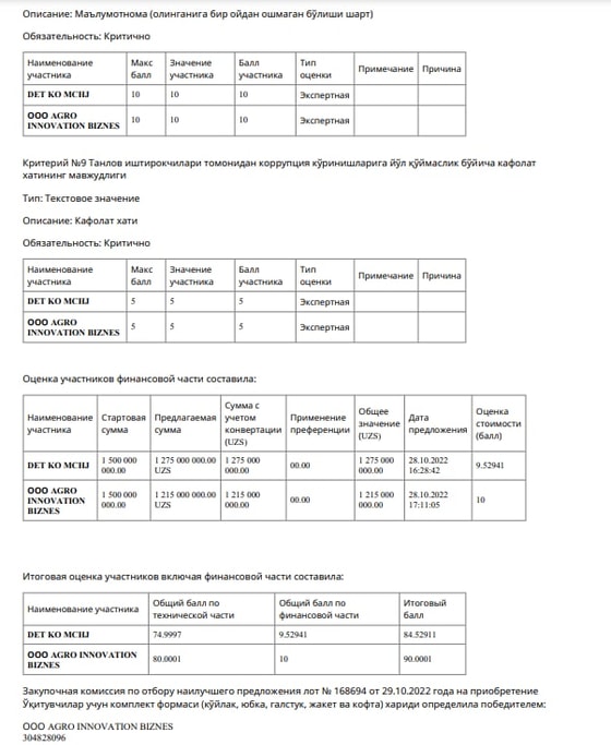 В соответствующем тендере победила компания AGRO Inovation Biznes, предложившая предоставить комплекты за 1 млрд 215 тысяч сумов.
