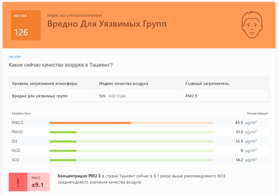 В 18:03 станция мониторинга в столице Узбекистана показывала результат в 126 AQI. Концентрация PM2.5 — в 9,1 раза выше рекомендуемого ВОЗ среднегодового значения качества воздуха.