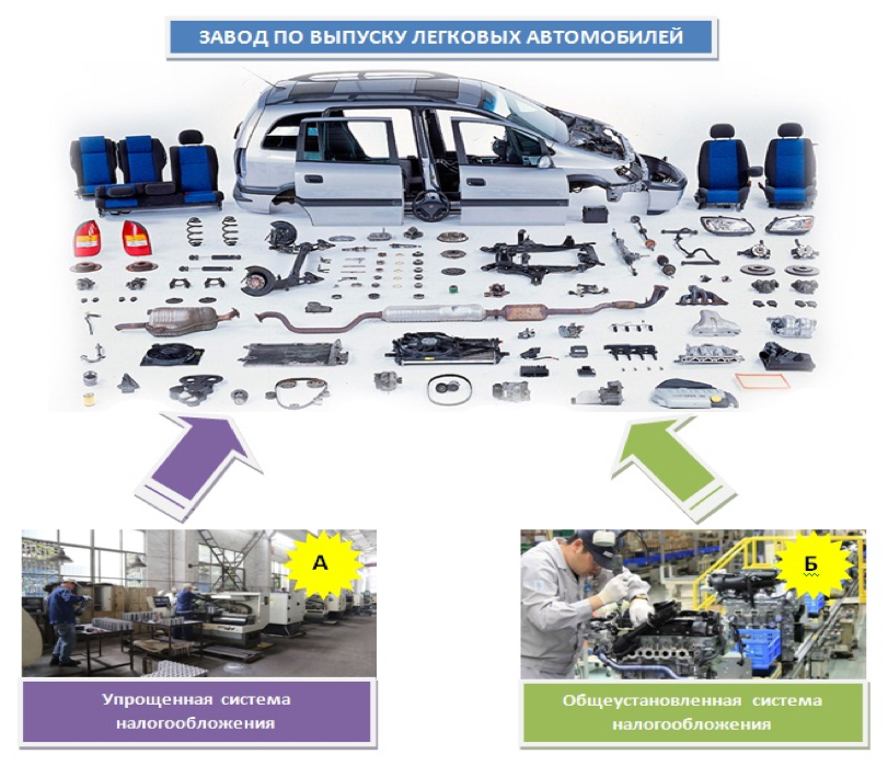Рассмотрим, какое влияние окажет переход на общепринятую систему налогообложения на примере производства легкового автомобиля (все показатели условны, любое совпадение – случайность).