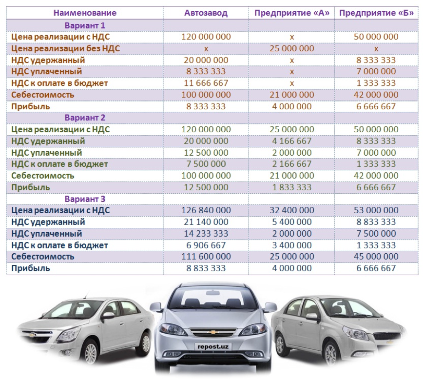 Предположим, что автомобиль на заводе собирают из деталей и комплектующих, которые производят предприятия «А» (плательщик Единого налогового платежа) и «Б» (плательщик общеустановленных налогов). Цена реализации автомобиля 120 млн сумов, предприятие «А» - годовой объем выручки больше 1 млрд сумов – поставляет запчасти (цена части комплекта для одного автомобиля 25 млн сумов) без выделения НДС, предприятие «Б», поставляющий другую часть комплекта для одного автомобиля на сумму 50 млн сумов, является плательщиком НДС.