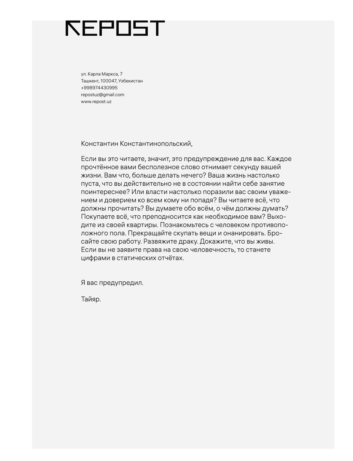 «Студия Артемия Лебедева» представила логотип, разработанный для новостного издания Repost.uz. В логотипе и стиле использован шрифт «Гаусс».