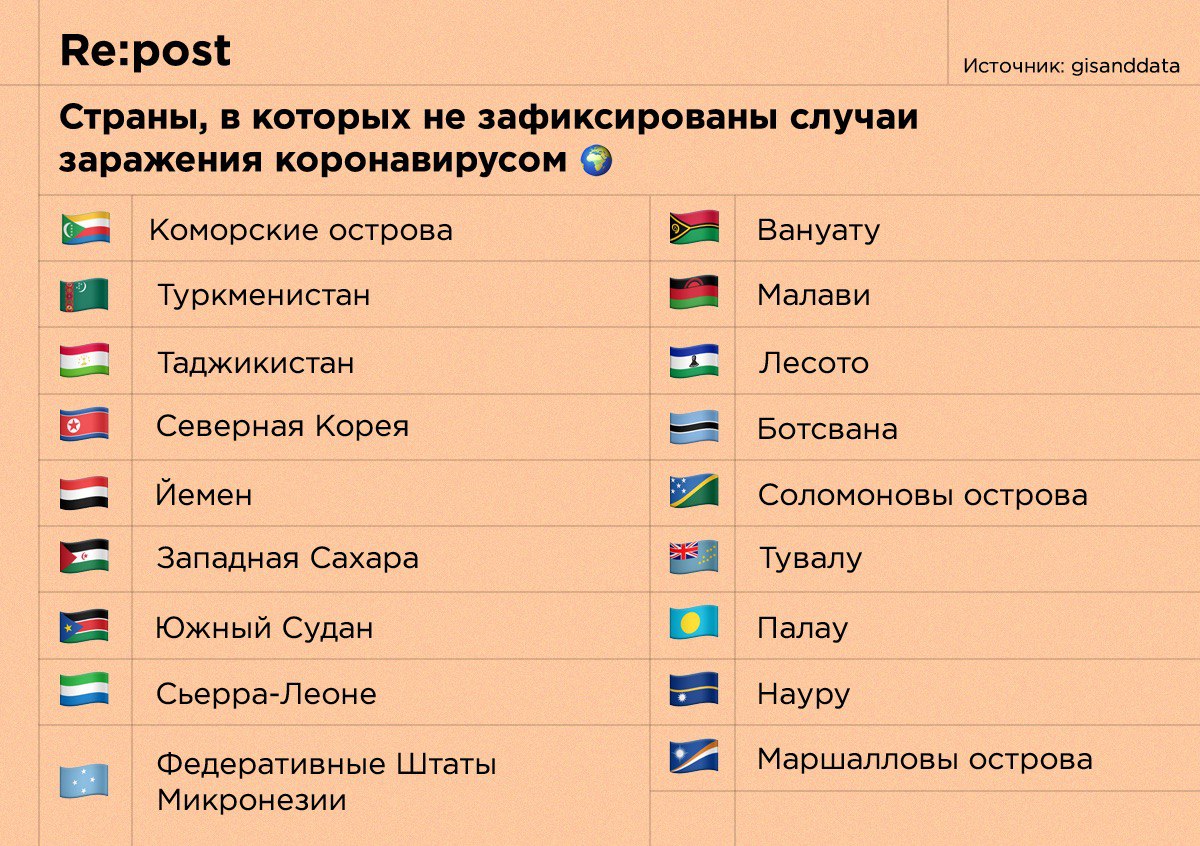 Список стран, в которых не выявлены случаи заражения: