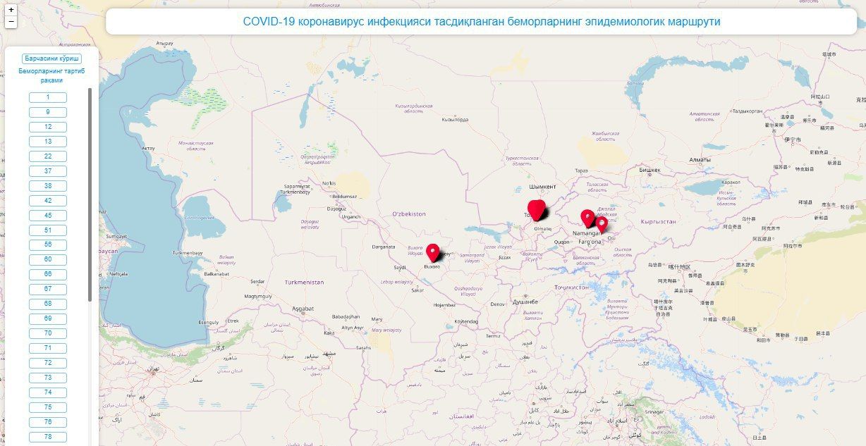 Минздрав совместно с UZINFOCOM на официальном веб-сайте министерства по COVID-19 создали карту, по которой можно отслеживать регионы, где обнаружен коронавирус, сообщает ведомство.