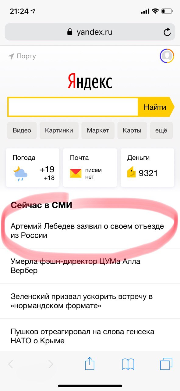 До этого он приложил скриншот, где новость о его эмиграции стала самой читаемой в СМИ.