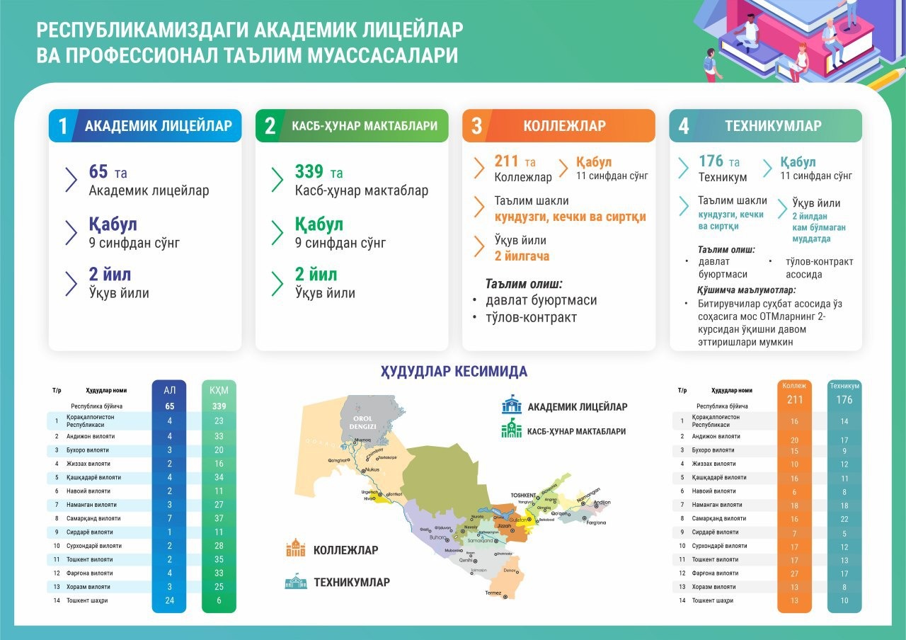 С нового 2020-2021 учебного года по всей стране будут организованы приемы в 65 академических лицеях, 339 профессиональных школах, 211 колледжах и 176 техникумах, сообщает пресс-служба Ташкентского хокимията, ссылаясь на Министерство народного образования.
