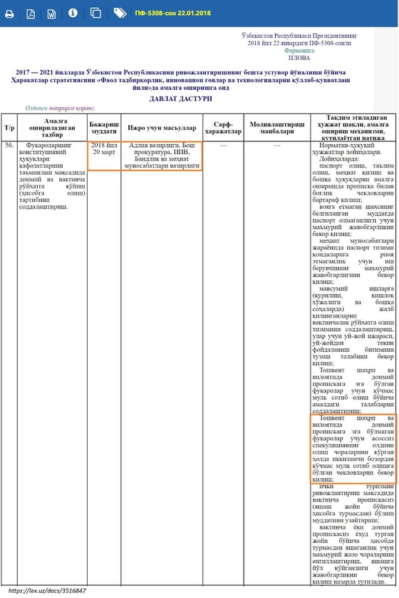 Пункт 56 Государственной программы предусматривал «упрощение процедуры постоянной и временной регистрации (прописки) в целях обеспечения гарантий конституционных прав граждан». Этим же пунктом была определена отмена ограничений на покупку недвижимости на вторичном рынке в городе Ташкенте и Ташкентской области для граждан, не имеющих постоянной прописки в столичном регионе. Действительно, длительное время граждане Узбекистана фактически делились на людей «столичных» и «областных»: при этом «столичные» имели право приобретать жилье на всей территории страны.