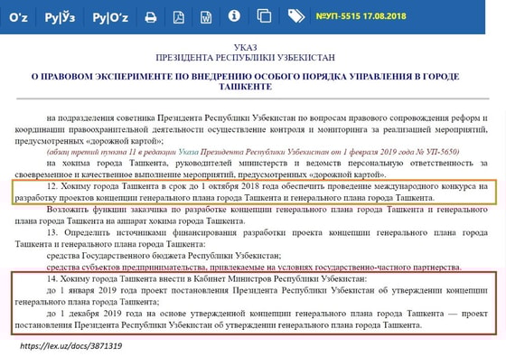 Указом президента «О правовом эксперименте по внедрению особого порядка управления в городе Ташкенте» от 17 августа 2018 года № УП-5515 хоким Ташкента должен был внести в Кабинет Министров «до 1 января 2019 года проект постановления Президента Республики Узбекистан об утверждении концепции генерального плана города Ташкента». В конце апреля 2020 года мы видим проект постановления президента «О мерах по разработке проекта генерального плана развития города Ташкента до 2041 года».