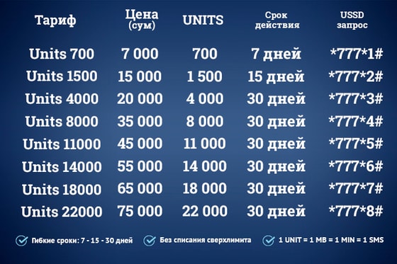 UNITS предлагает абонентам самостоятельно определять свои ресурсы, исходя из простого расчета – 1 Unit = 1 МБ, 1 минута или 1 SMS. Вся линейка включает в себя 8 тарифных планов стоимостью от 7 000 до 75 000 сумов сроком от 7 до 30 дней. Так, подобрав для себя самый выгодный тарифный план и подключив от 700 до 22 000 Unit-ов, вы можете тратить их на мобильные звонки, интернет или SMS-чаты в том соотношении, которое удобно вам. Более того, вас ожидает приятный расчет – чем больше Unit-ов вы приобретаете, тем дешевле вам обходится 1 Unit в конечном итоге!