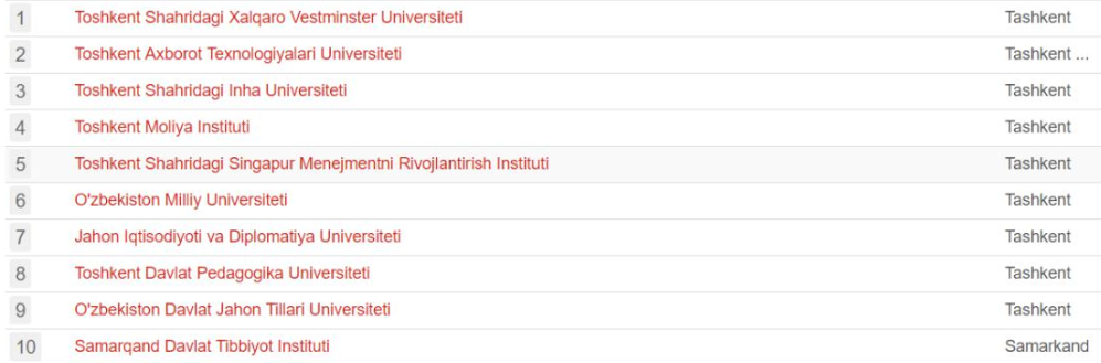 Список высших образовательных учреждений возглавляют вузы города Ташкента (Международный Вестминстерский университет в городе Ташкенте, Ташкентский университет информационных технологий, Университет Инха в городе Ташкенте).