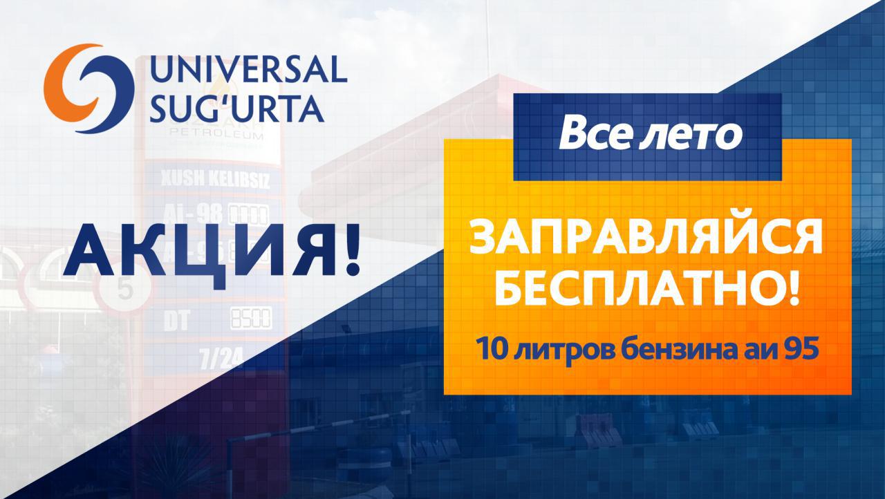 Страховая компания Universal Sug'urta объявляет о начале беспрецедентной акции для всех автомобилистов, имеющих страховые полиса. Только этим летом вы сможете стать обладателями бесплатного купона на заправку 10 литров бензина Аи 95, который вам любезно зальют на любой АЗС "Jizzakh Petroleum".