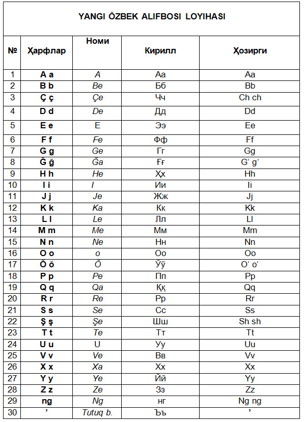 Узбекский алфавит, не менявшийся с 1995 года, ожидают перемены. До конца текущего года в республике планируют принять новую версию алфавита, базирующего на латинице. Новый проект предполагает появление 30 знаков и 28 букв, апострофа для обозначения твердого знака в письменном виде, а также сочетание «ng». Об этом во вторник, 6 ноября, сообщило УзА.