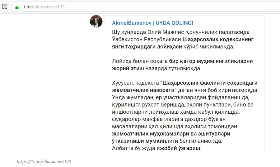 Неужели никто не замечал, что чиновники нарушают законодательство? Были отдельные критические выступления депутатов Законодательной палаты, председателя Общенационального движения «Юксалиш» Акмаля Бурханова. В июле 2019 года об этой проблеме высказался министр юстиции Русланбек Давлетов, который потребовал от всех хокимиятов прекратить нарушать права граждан, включая право собственности.