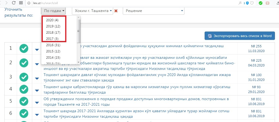 Видно, что в 2017 году хоким Ташкента разместил в Национальной базе данных законодательства LEX UZ всего 3 решения, в 2018 – 17, в 2019 – 12, а в этом году – 4 решения. Остальные решения должны считаться недействительными согласно закону «О нормативно-правовых актах». Жаль, что хоким, городские организации и застройщики так не считают и активно выполняют неопубликованные решения.
