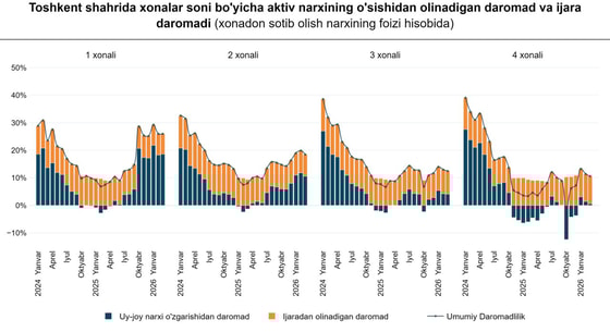 Daromadlilik darajasi bo‘yicha investitsion jozibadorligi yuqoriroq bo‘lgan 1 va 2 xonali xonadonlar uchun daromadlilik darajasi mos ravishda 29,8% (2025-yil mart oyida - 9,3%) va 17,4%ni (4,8%) tashkil qilgan bo‘lsa, 3 va 4 xonali xonadonlarda nisbatan pastligicha saqlanib qoldi.