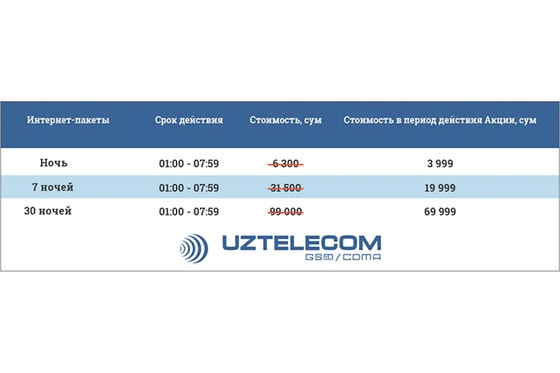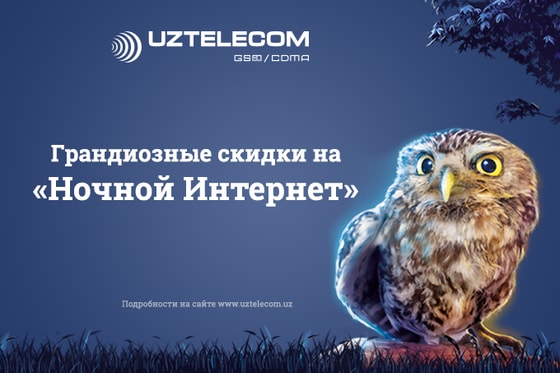Специально для активных «ночных» пользователей мобильным интернетом с 23 февраля по 13 апреля 2021 года UZTELECOM запускает грандиозную акцию на услугу «Ночной Интернет» для абонентов мобильной связи стандарта GSM!