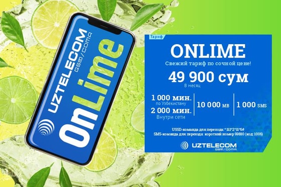 ONLIME предлагает 10 000 МБ, 1000 минут (+2000 минут для звонков внутри сети) и 1000 SMS всего за 49 900 сумов в месяц. Окунитесь в прохладу выгодного общения с тарифом ONLIME от Национального мобильного оператора UZTELECOM!