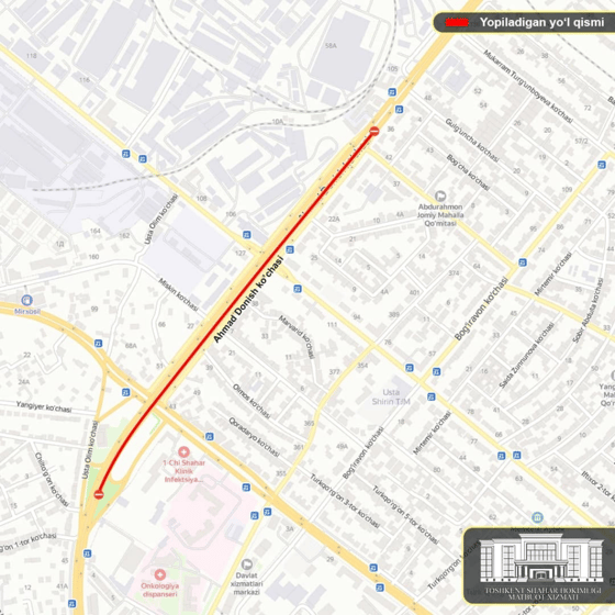 С Юнусабада в сторону Себзара на данном надземном путепроводе будет организовано двустороннее движение. Водителям рекомендовано воспользоваться объездными путями.