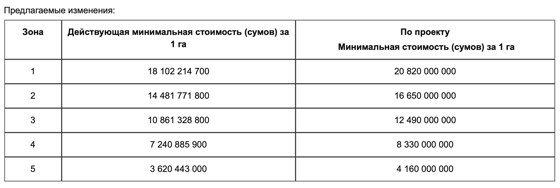 Согласно проекту, планируется изменить минимальную стоимость права постоянного пользования земельным участком в Ташкенте, определяемой в разрезе экономических зон и районов города.