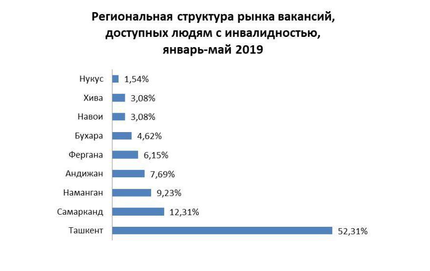 Компании, которые активно размещают вакансии, и готовы брать в штат людей с инвалидностью находятся, в основном, в Ташкенте. Заметен большой отрыв между столицей и другими городами. Кроме столицы, все остальные города размещают вакансии неактивно.