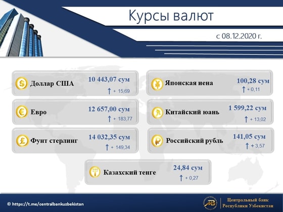 Центральный банк Узбекистана установил новые курсы иностранных валют по отношению к суму. Курс доллара составил 10 443,07 сумов (+15,69), а евро 12 657,00 сумов (+183,77).